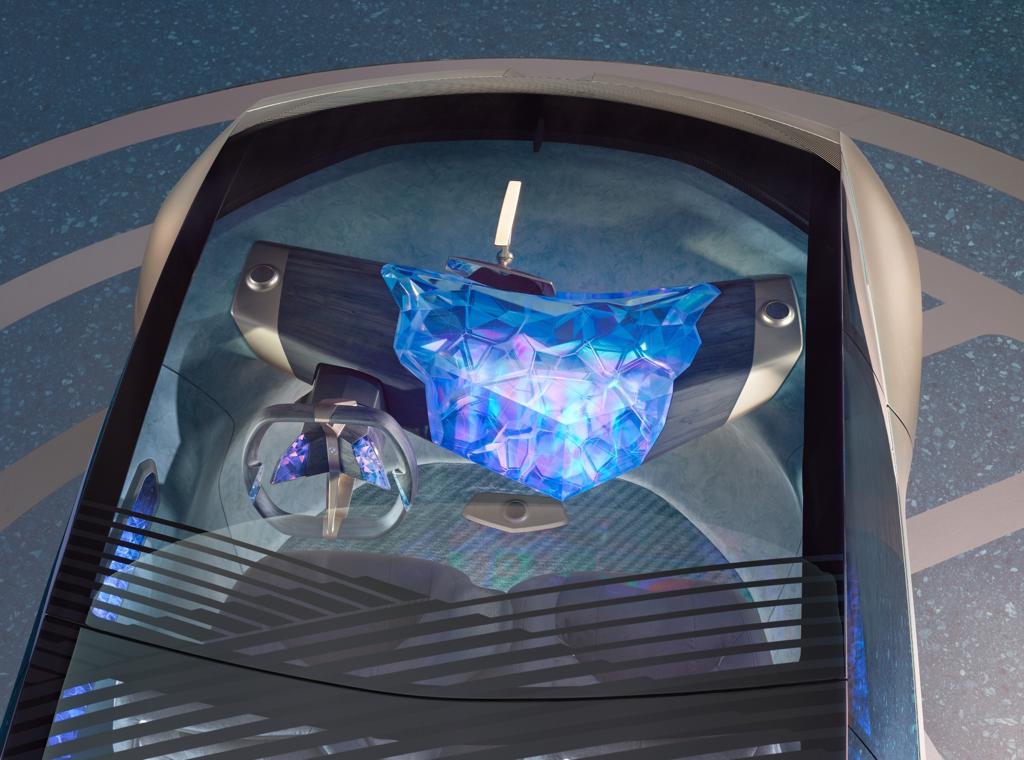 Circular product design begins by thinking about things differently. For the BMW i Vision Circular this meant scrutinising processes and manufacturing technologies and thinking differently. Hence, the classical instrument panel was turned into a next-generation phygital user interface which we call “Phygital Icon”. Here, it takes the form of a hovering, V-shaped sculpture that projects out into the cabin. At its heart is a 3D-printed, crystal body with nerve-like structures running through it, great visual depth and an enthralling lighting effect. This is where the vehicle’s “thinking” is visualised, allowing the user to see its intelligence at work. The instrument panel also serves as an area for interaction though, giving form to the fundamental idea of creating experiences that extend far beyond displays and buttons.